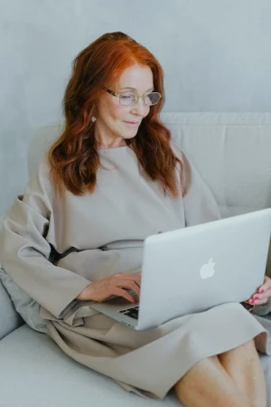 Woman with curly hair wearing glasses and a brown blazer, holding a laptop close to her chest.
